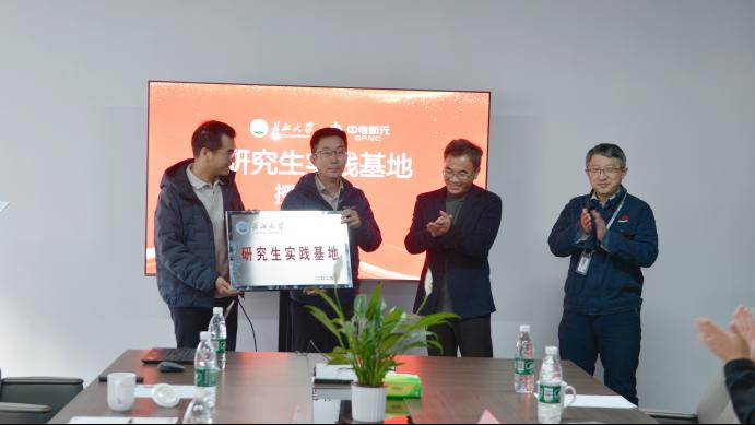 仪式现场,詹炜副院长与刘总代表双方郑重签署合作协议,并共同为研究生实践基地揭牌。詹院长在致辞中强调,中电新元的产业优势与技术资源,与学院的学科方向契合,实践基地的建立,将为学院研究生搭建接触电力科技行业前沿技术、参与真实项目研发的优质平台,助力“产学研”合作;刘总则表示,企业将充分发挥产业资源优势,为实践基地配备专业指导团队与完善的实践条件,与学院携手培养符合行业需求的复合型人才。
