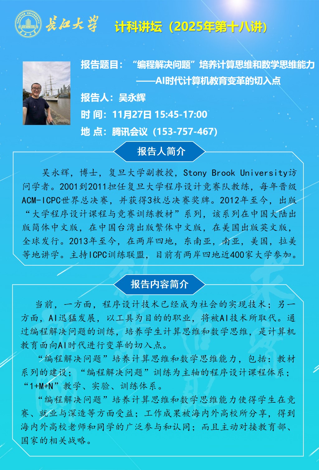 计科讲坛(2025年第十八讲):“编程解决问题”培养计算思维和数学思维能力——AI时代计算机教育变革的切入点